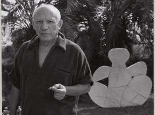 Pablo Picasso avec un "Joueur de diaule" dans le jardin de…
