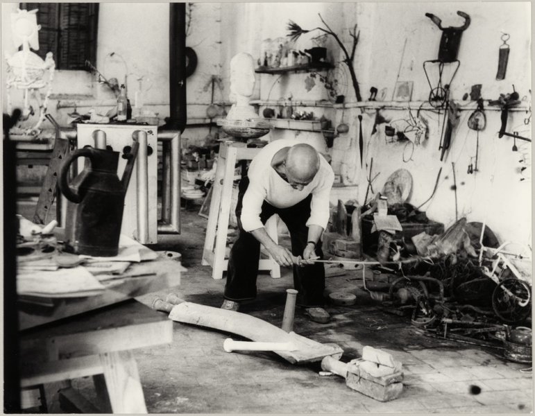 Copié dans le presse-papier :Pablo Picasso assemblant la sculpture "La Femme à la clé" ou dit "La Taulière"… - André Villers - s.d. - https://cep.museepicassoparis.fr/en/node/126302