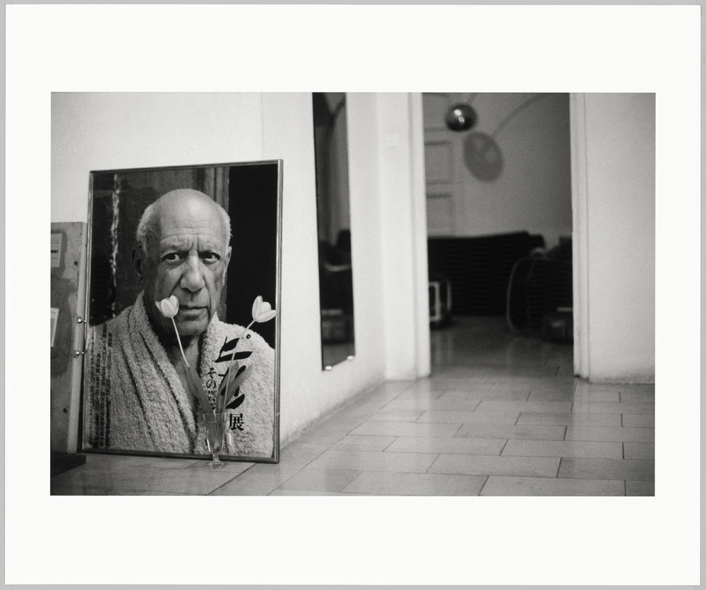 Affiche de Pablo Picasso en robe de chambre à l'entrée du château de Vauvenargues en 1962 pour la Rétrospective de 1964 au Japon posée dans un coin de Notre-Dame-de-Vie avec un bouquet de fleurs, Mougins, circa 1975