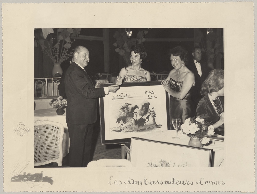 Alexandre Maguy et deux femmes non identifiées présentant "Scène de tauromachie" du 15 avril 1960 de Picasso, aux ambassadeurs, Palais des festivals, Cannes, en 1960