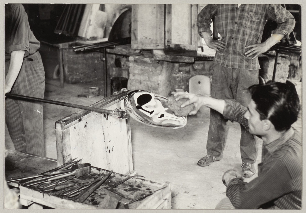 Artisan polissant une sculpture en verre soufflé d'après le dessin "Le Cabri" de Pablo Picasso à l'atelier Fucina degli Angeli, Venise, en 1964