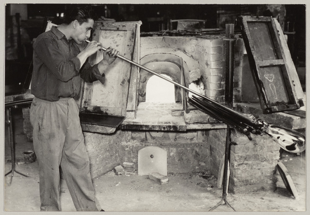 Artisan réalisant une sculpture en verre soufflé d'après le dessin "Le Cabri" de Pablo Picasso à l'atelier Fucina degli Angeli, Venise, en 1964