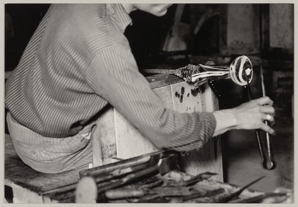 Artisan réalisant une sculpture en verre soufflé d'après le dessin "Le Cabri" de Pablo Picasso à l'atelier Fucina degli Angeli, Venise, en 1964