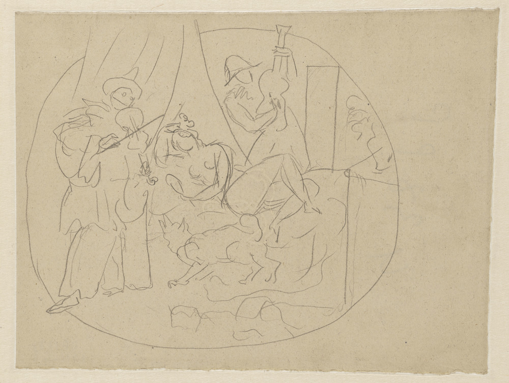 Avant projet de rideau de scène pour le ballet Pulcinella: sérénade de Pierrot et Arlequin musiciens à une femme nue allongée, à ses pieds un chien