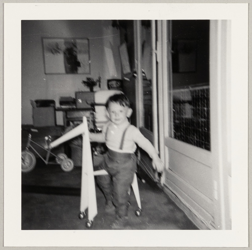 Bernard Picasso à deux ans dans une pièce sur son cheval à roulettes, [Boisgeloup], [1961]