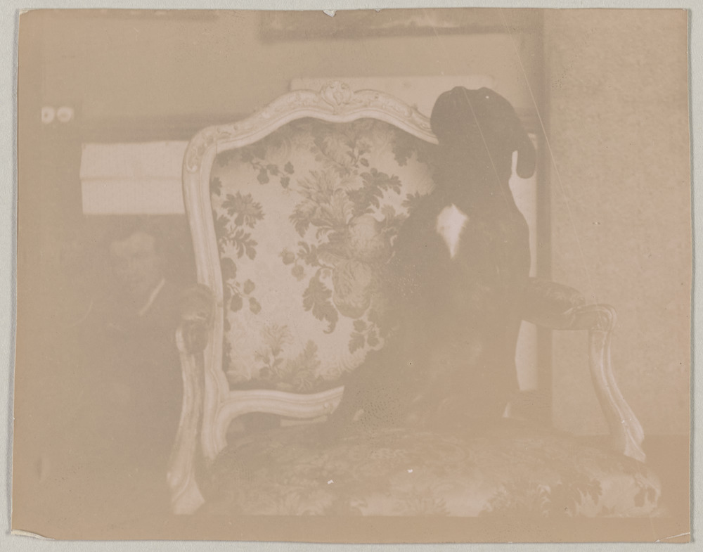 Bob, le chien de Serge Férat, sur une chaise de l'atelier du 67 bd Saint-Jacques, Paris, dans les années [1920]