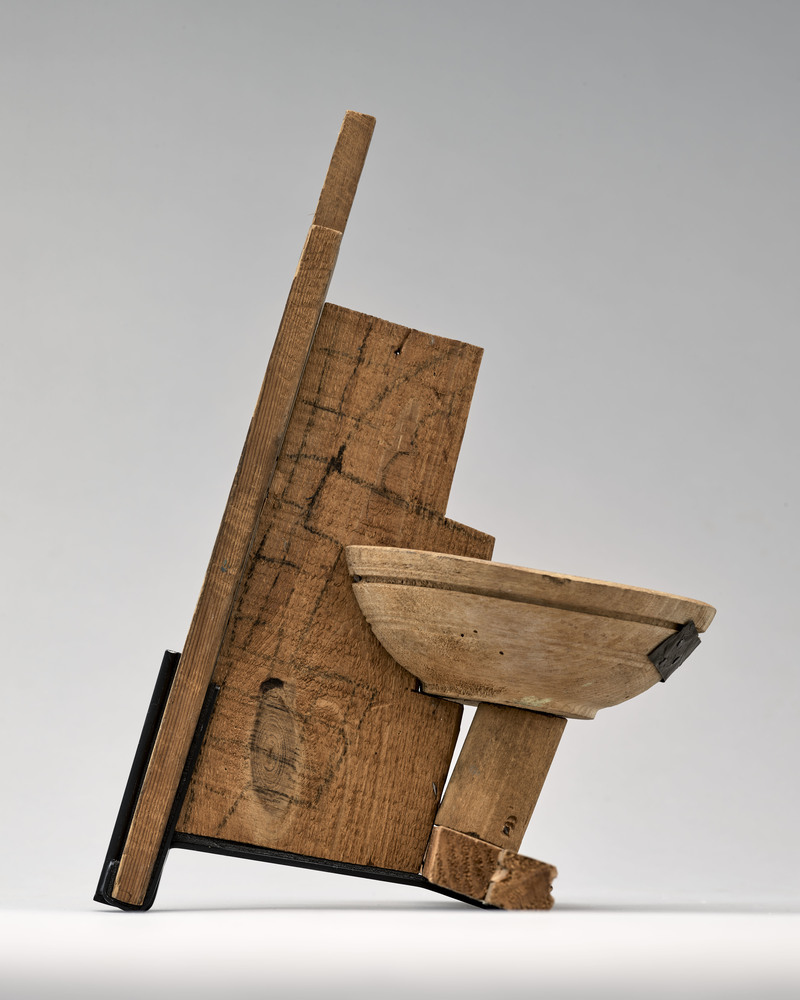 Eléments de bois de sapin et de pin, fer blanc, clous avec traits au fusain