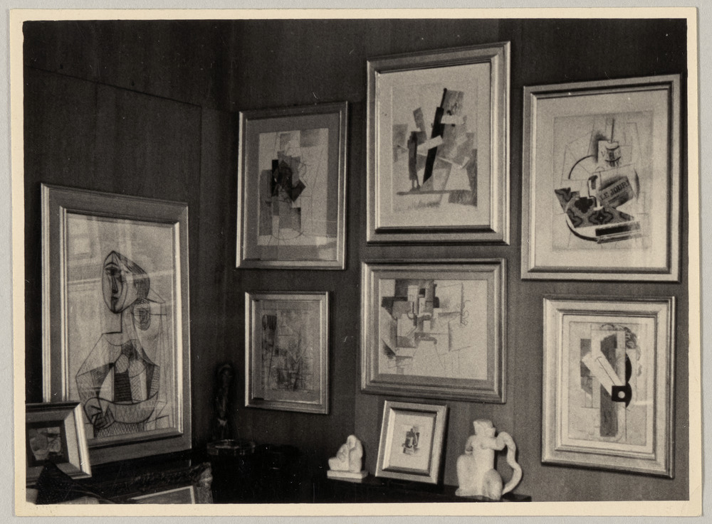 "Bouteille de vieux marc, verre et journal", "Tête de jeune fille", un portrait de femme et deux petites sculptures en [plâtre] d'Henri Laurens dans le salon de Marie Cuttoli, [années 1950]