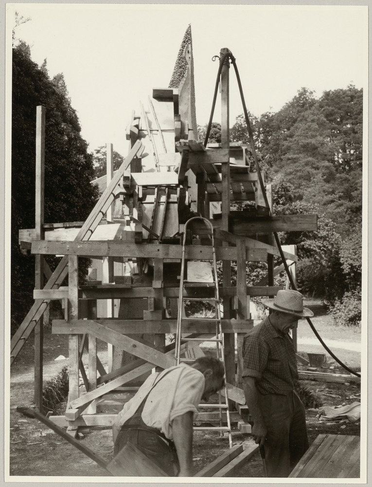 Cameron et Sigurd Frager devant la sculpture "Femme aux bras écartés" en cours de finition, prieuré St-Hilaire, Chalo-Saint-Mars, en 1962