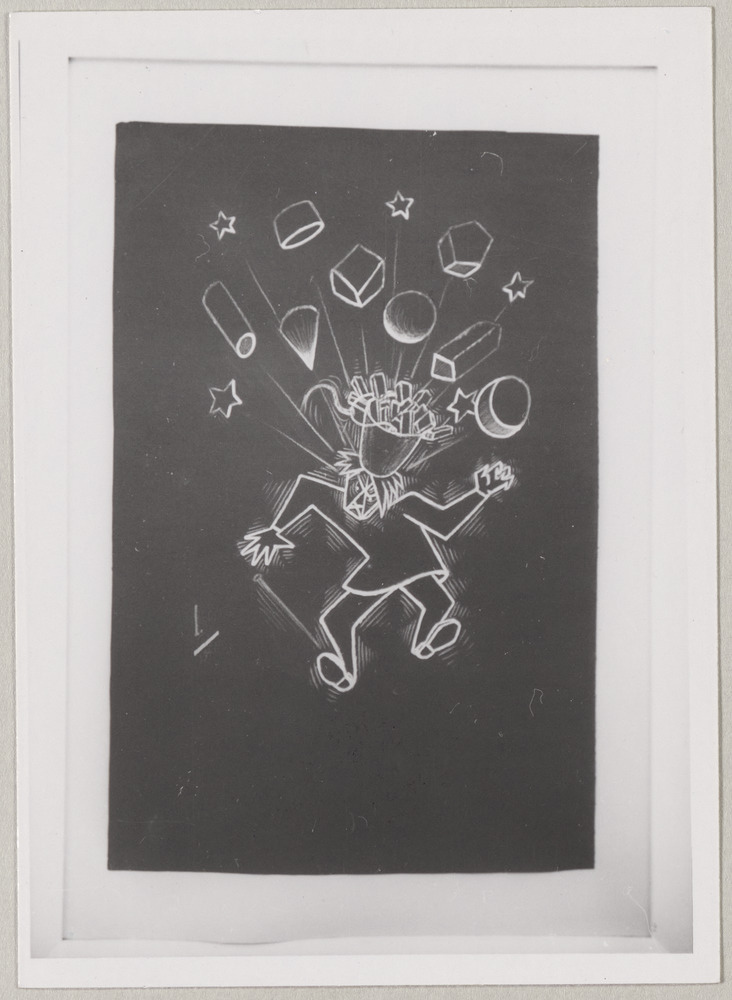 Enveloppe en papier et encres bleue et noire qui contenait des tirages argentiques NB de caricatures de Pablo Picasso réalisées par un collectif "Agrupacion de caricaturas personales" et annotation à l'encre bleue : "Algunas fotos de las caricaturas presentadas"