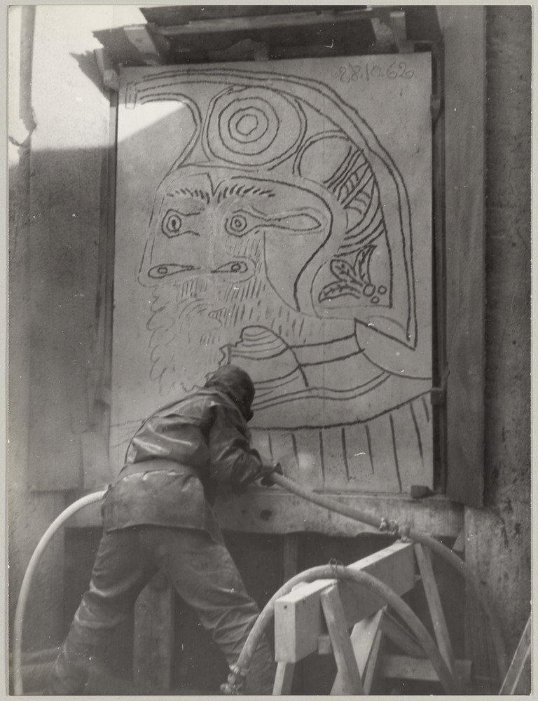 [Carl Nesjar] avec l'appareil de sablage en train de réaliser le panneau "Tête…