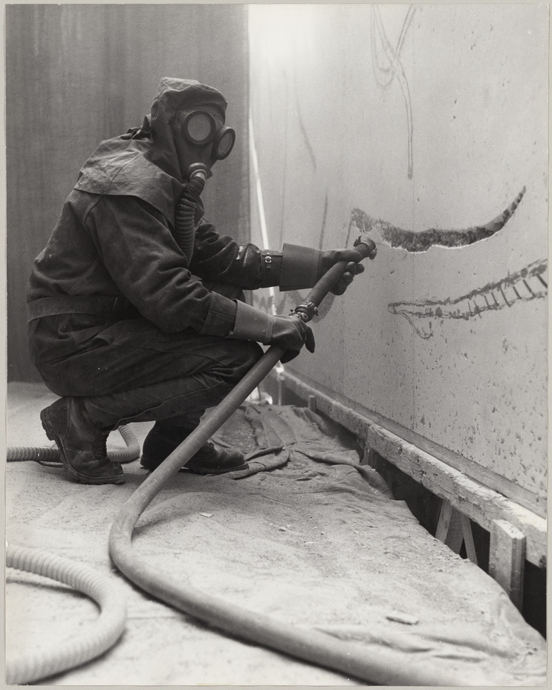 [Carl Nesjar] avec l'appareil de sablage en train de réaliser un panneau,…