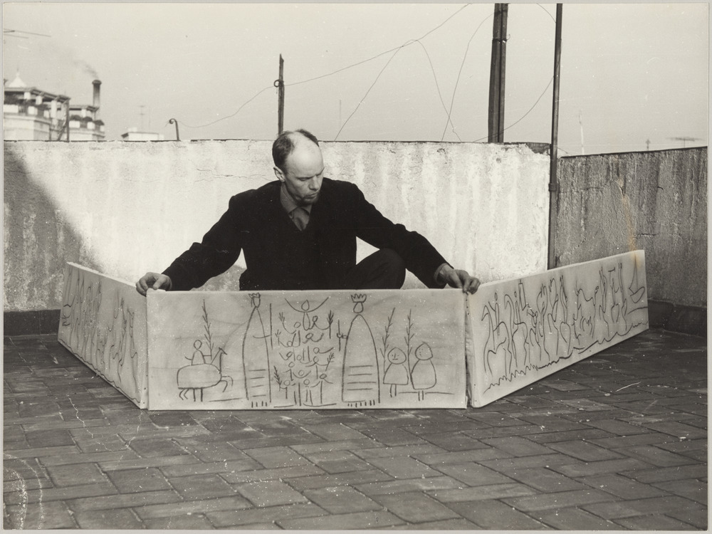 Carl Nesjar avec les reproductions sur toiles des dessins de Pablo Picasso pour la réalisation de frises monumentales en bétogravure sur la façade du Collège des architectes de Catalogne, à Barcelone
