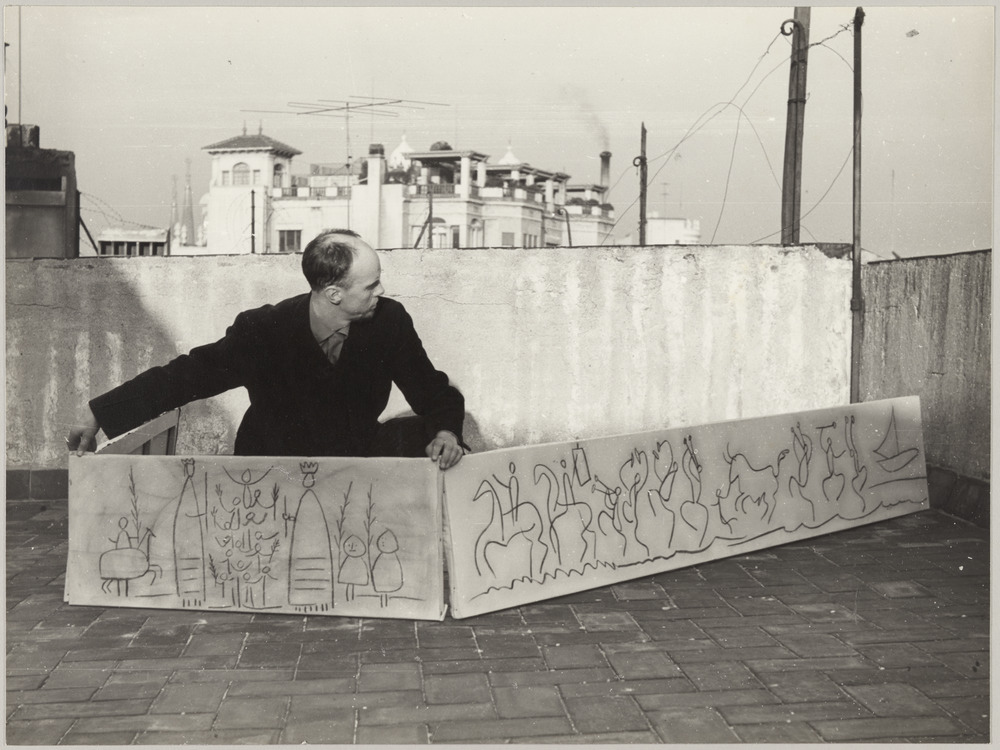 Carl Nesjar avec les reproductions sur toiles des dessins de Pablo Picasso pour la réalisation de frises monumentales en bétogravure sur la façade du Collège des architectes de Catalogne, à Barcelone