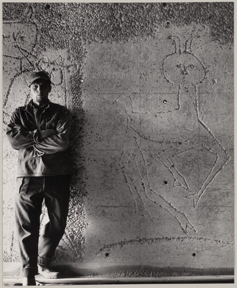 Carl Nesjar devant le satyre et le faune dansant - détail de l'oeuvre gravée sur béton "Satyre, faune, centaure au trident" destinée à orner un mur du Palais du Gouvernement, Oslo, [1956-1957]