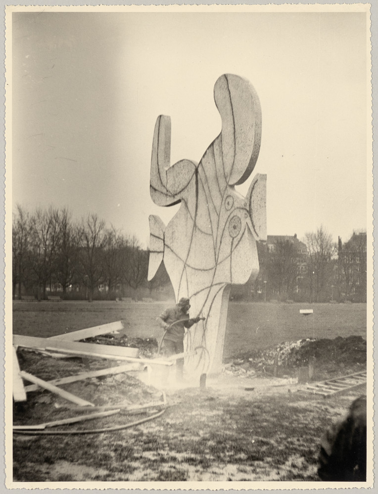 [Carl Nesjar] en train de sabler la sculpture en bétogravure "Oiseau", au Vondelpark, Amsterdam, en 1965
