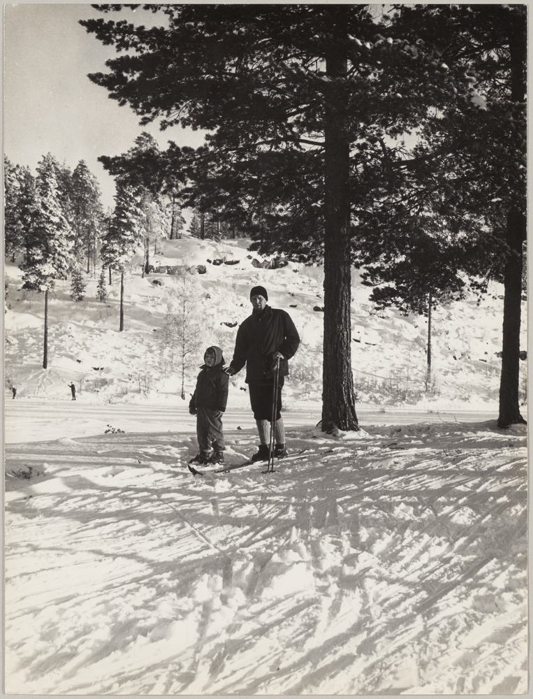 Annotation manuscrite au dos, centré : "en faisant du ski avec Gro, au bord d'un lac, à 1km. de la maison à Oslo - Janvier 1963"