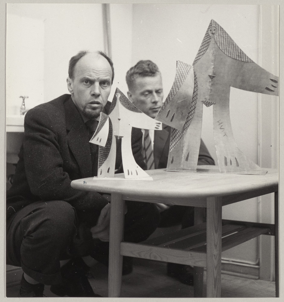 Carl Nesjar et un homme assis derrière la maquette de la "Femme aux bras écartés" et une version intermédiaire, Oslo, en avril 1962
