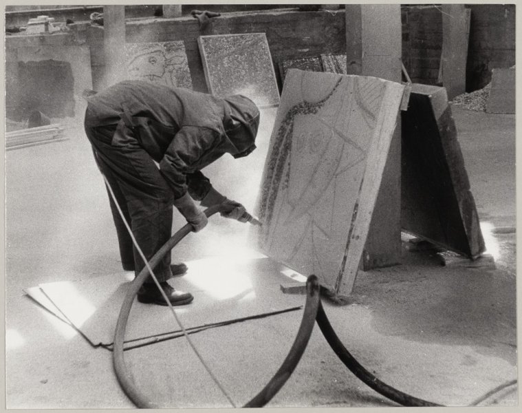 Carl Nesjar sablant une plaque de béton d'après un dessin de Pablo Picasso, sur le chantier du Collège des architectes de Catalogne, Barcelone, en février 1960