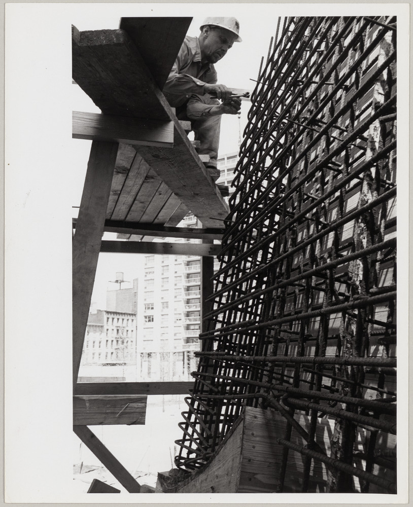 Carl Nesjar serrant des armatures de fer sur le chantier de la sculpture en bétogravure "Sylvette", New-York University, en 1968
