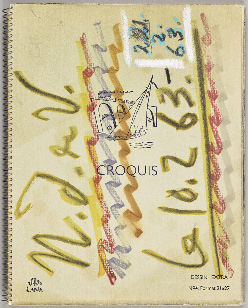- Auteur(s)Titre1e de couverture avec inscriptionDate10 février 1963 - 16 décembre 1963Type de supportDessinNuméro d'inventaireMP1886 (1c)Auteur(s)Titre1e de couverture avec inscriptionDate de création10 février 1963 - 16 décembre 1963Lieu de créationMouginsType de supportDessinTechniqueGouache, crayons cire et crayon graphite sur papier, 1ère de couverture du carnet MP1886Dimensions21 x 27 x 1 cmMarque / InscriptionsD.B.M. à la gouache, au crayon noir et au crayon bleu : le 10.2.63- [date soulignée] / 21 [nombre souligné] / 2 / 63 [nombre souligné]