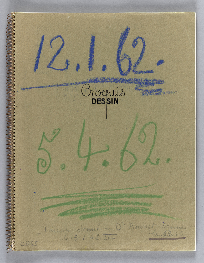 Collection Jacqueline Picasso - Auteur(s)Titre[4e de couverture d'un carnet]Date12 janvier 1962 - 5 avril 1962Type de supportDessinNuméro d'inventaireMP1990-114 (4c)Auteur(s)Titre[4e de couverture d'un carnet]Date de création12 janvier 1962 - 5 avril 1962Lieu de création[Mougins]Type de supportDessinTechniqueCrayons cire sur carton, 4ème de couverture du carnet MP1990-114Dimensions35 x 27 cmMarque / InscriptionsD [souligné].M. au crayon cire : 12.1.62. / 5.4.62.Numéro d'inventaireMP1990-114 (4c)Copyright© Succession PicassoAncienne(s) appartenance(s)PICASSO Jacqueline, Paris (France)
