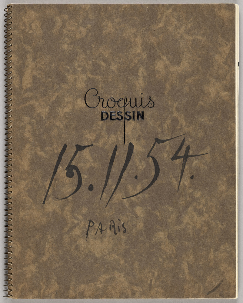 1ère de couverture en papier marbré marron sur le plat de laquelle les mots "dessins / CROQUIS" sont estmapés à chaud en lettres noires.Numéro d'inventaireMP1883 (1c)Copyright© Succession PicassoAncienne(s) appartenance(s)PICASSO Pablo (France)