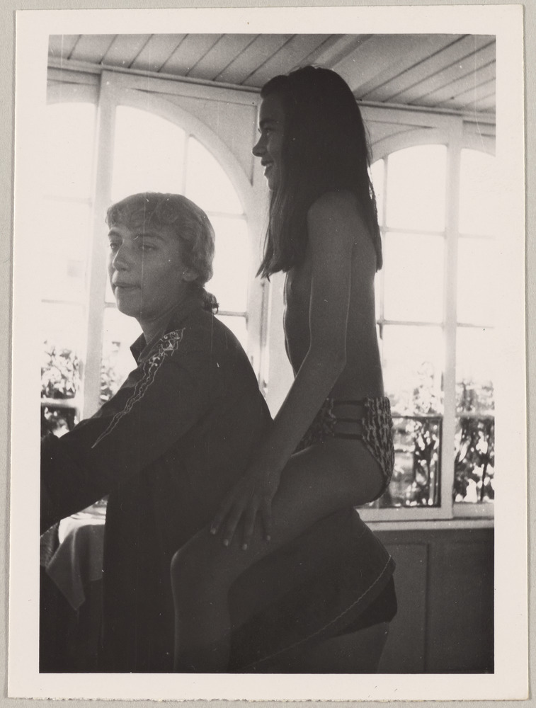 Caroline Lemort sur le dos de Maya Picasso, au restaurant Chez Tetou, Golfe-Juan, été 1954