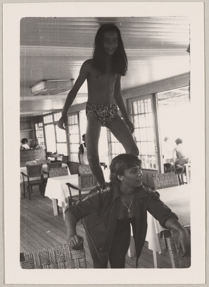 Caroline Lemort sur les épaules de Maya Picasso, au restaurant Chez Tetou, Golfe-Juan, été 1954