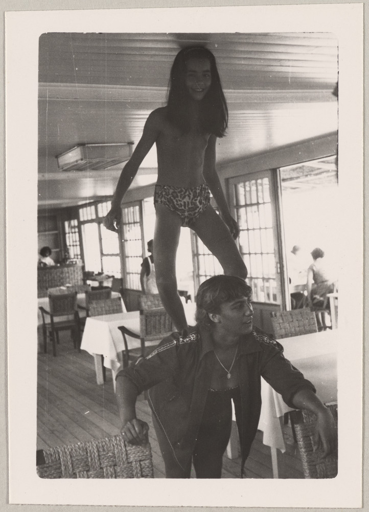 Caroline Lemort sur les épaules de Maya Picasso, au restaurant Chez Tetou, Golfe-Juan, été 1954