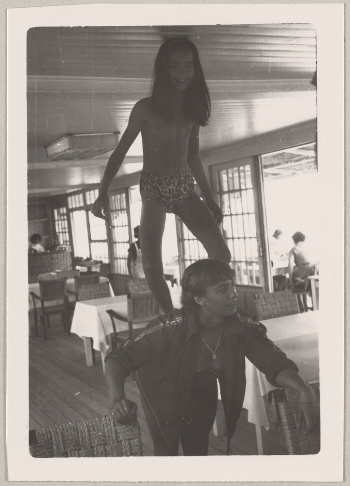 Caroline Lemort sur les épaules de Maya Picasso, au restaurant Chez Tetou, Golfe-Juan, été 1954