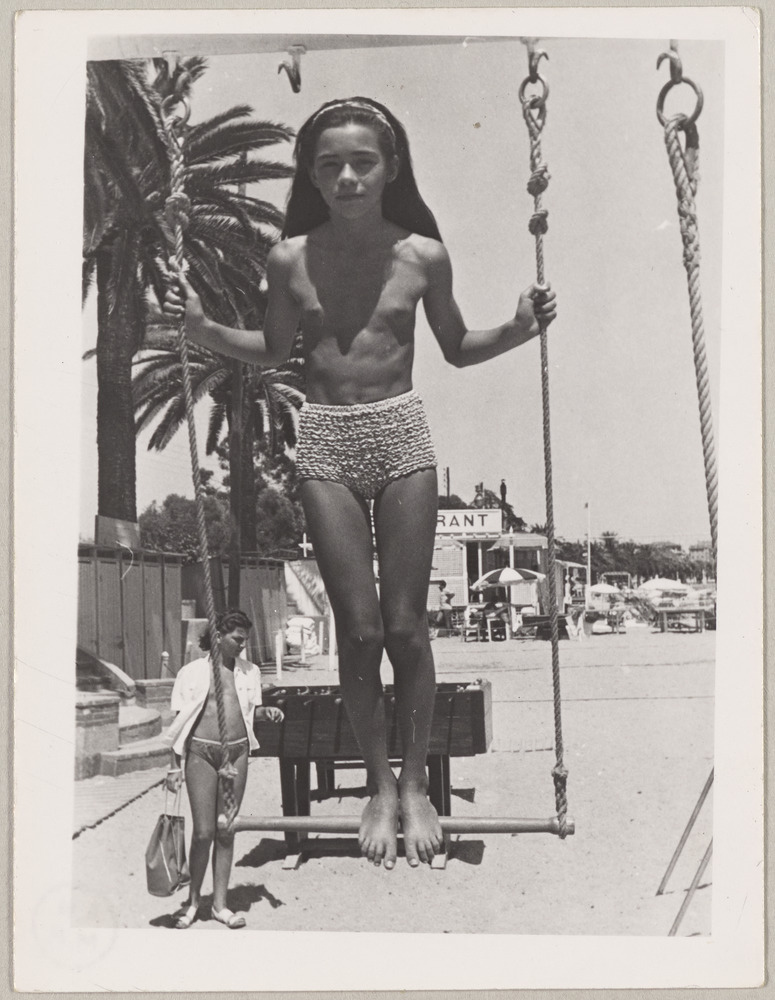 Caroline Lemort sur un trapèze, plage de Golfe-Juan, été 1954