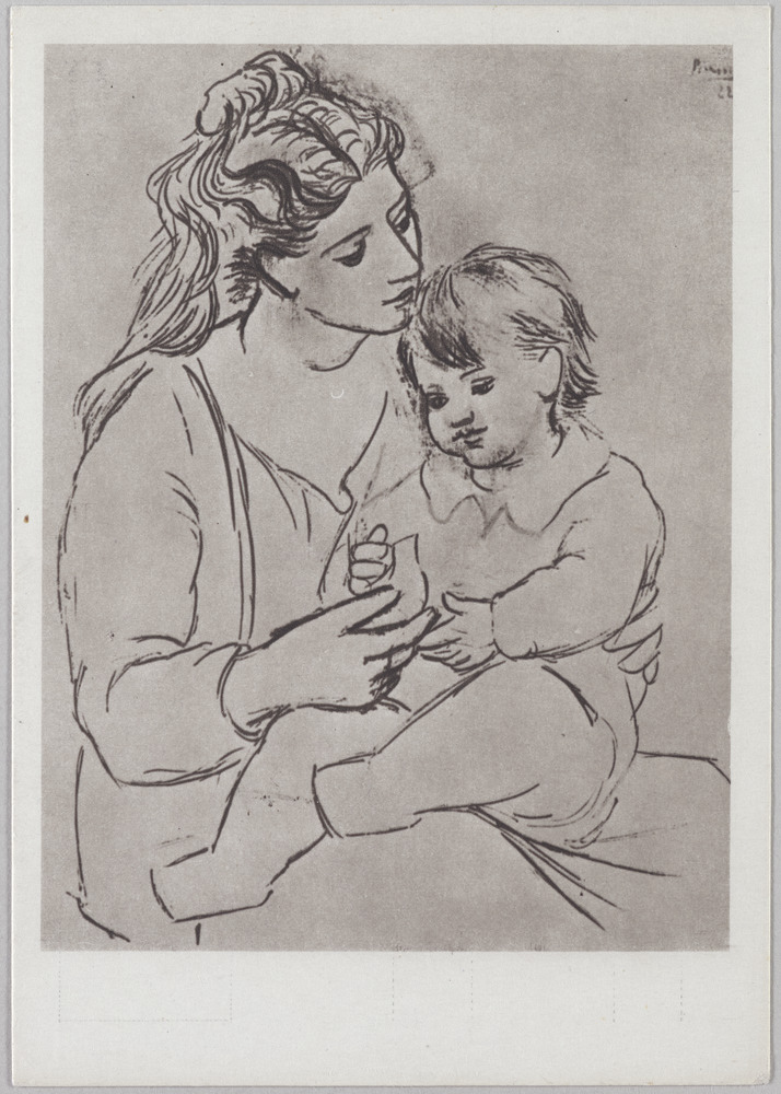 Carte de l'Union des femmes antifascistes espagnoles illustrée par un dessin "Mère et enfant" de Pablo Picasso
