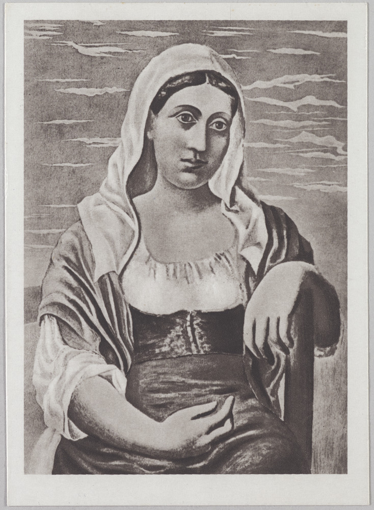 Carte de l'Union des femmes antifascistes espagnoles illustrée par une huile "Portrait de femme" de Pablo Picasso