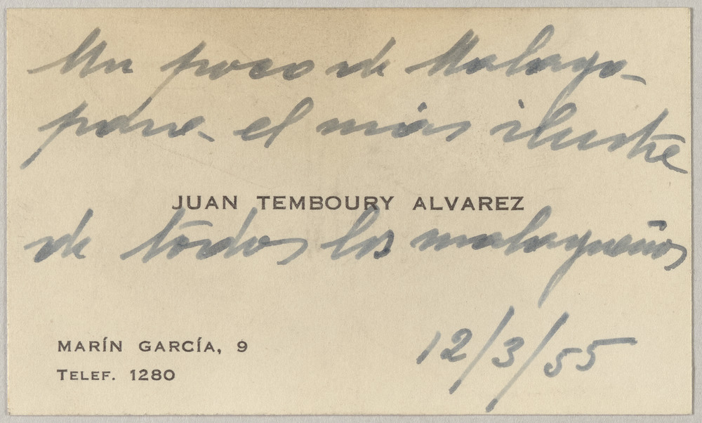 Copié dans le presse-papier :Carte de visite de Juan Temboury Álvarez (Málaga) datée du 12 mars 1955 - s.d. - https://cep.museepicassoparis.fr/explorer/carte-de-visite-de-juan-temboury-alvarez-malaga-datee-du-12-mars-1955-apph12567