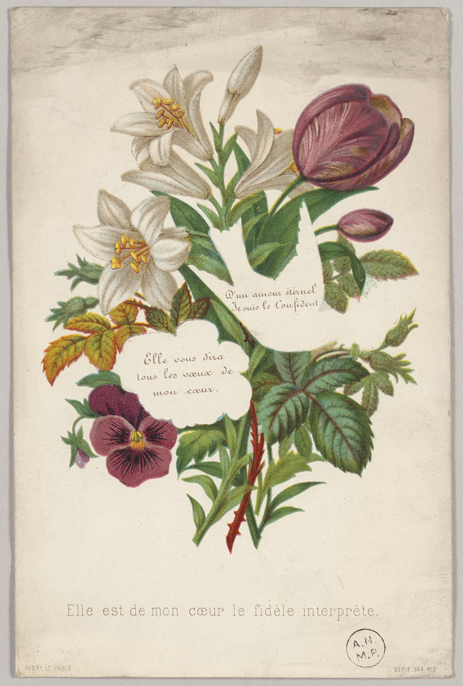 Carte florale et colombe avec message imprimé : "D'un amour éternel / Je suis le confident / Elle vous dira tous les voeux de mon coeur / Elle est de mon coeur le fidèle interprète." - Série 344 N°3