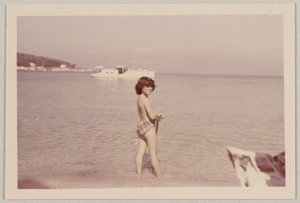 Catherine Hutin au bord de l'eau, plage de Golfe-Juan, années 1950