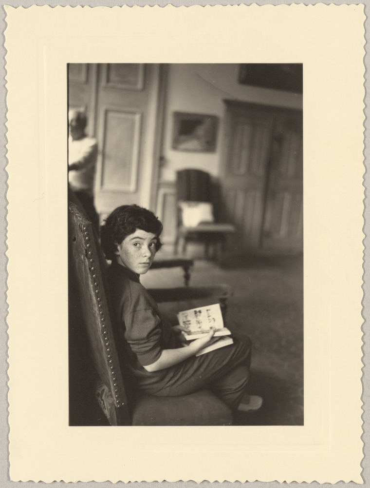 Catherine Hutin avec un livre sur les genoux, [au Château de Vauvenargues]