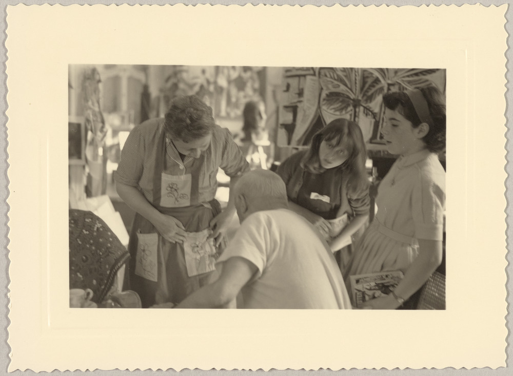 Catherine Hutin et une amie observant Pablo Picasso dessiner sur le tablier de Lucienne à La Californie, Cannes