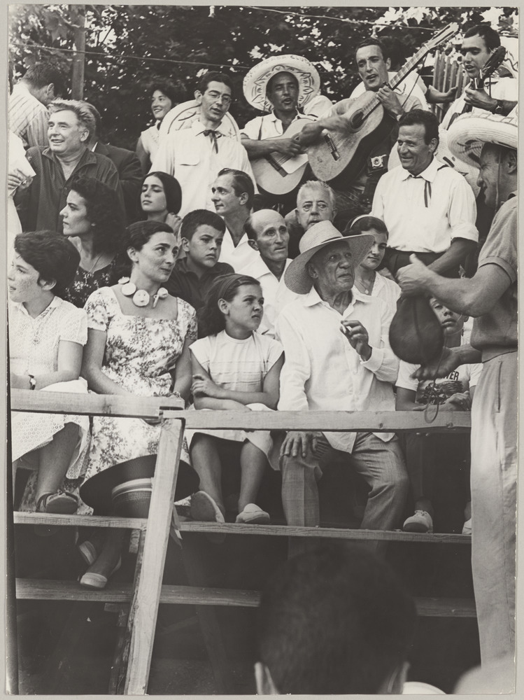 Catherine Hutin, Jacqueline Roque, Pablo Picasso et ses enfants Paloma et Claude, et au second plan, Inès Sassier, son fils Gérard, Paul Derigon, Édouard Pignon et Jacques Prévert à la corrida de Vallauris, en 1958
