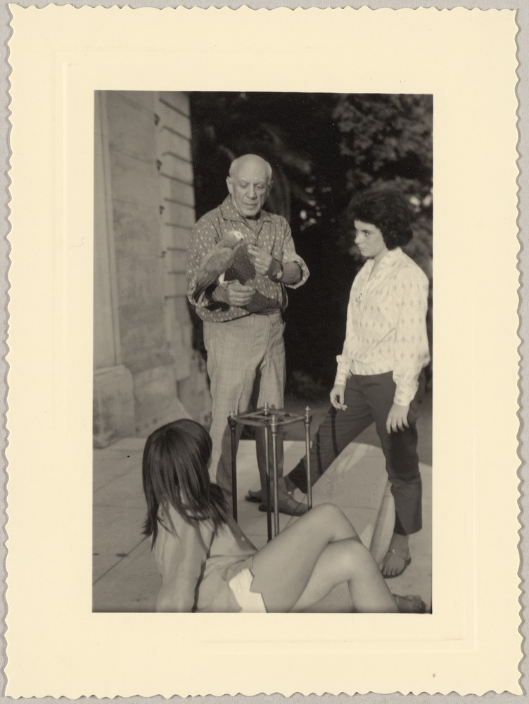 Catherine Hutin regardant un perroquet posé sur la main de Pablo Picasso avec Paloma assise sur les marches du perron de La Californie, Cannes, en [1960]