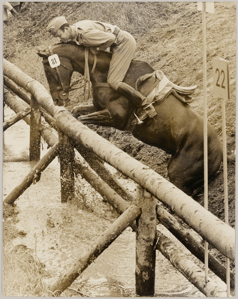 Cavalier franchissant une barrière sur le parcours d'un concours hippique, [Stockholm], en juin 1956