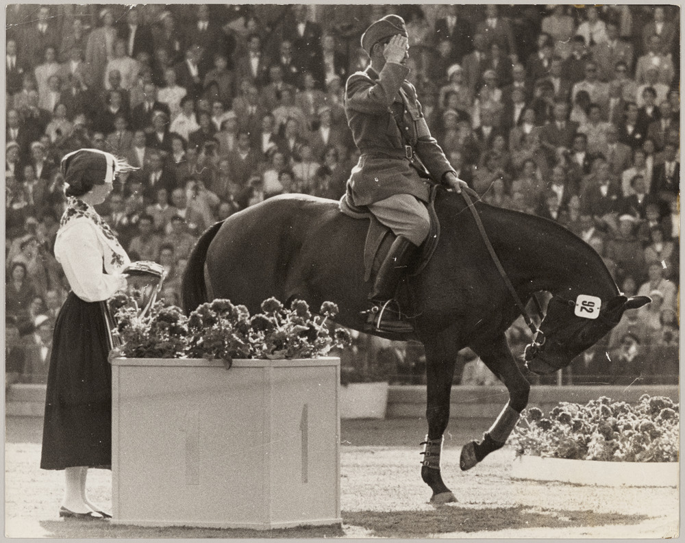 Cavalier lors d'un concours hippique, [Stockholm], en juin 1956