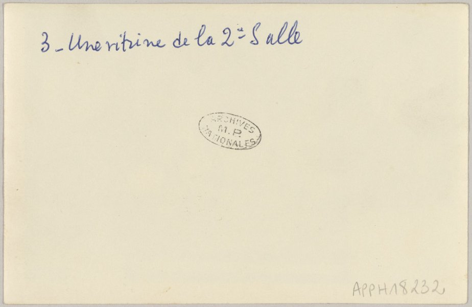 Annotation manuscrite au dos, en haut : "3 - Une vitrine de la 2e salle"