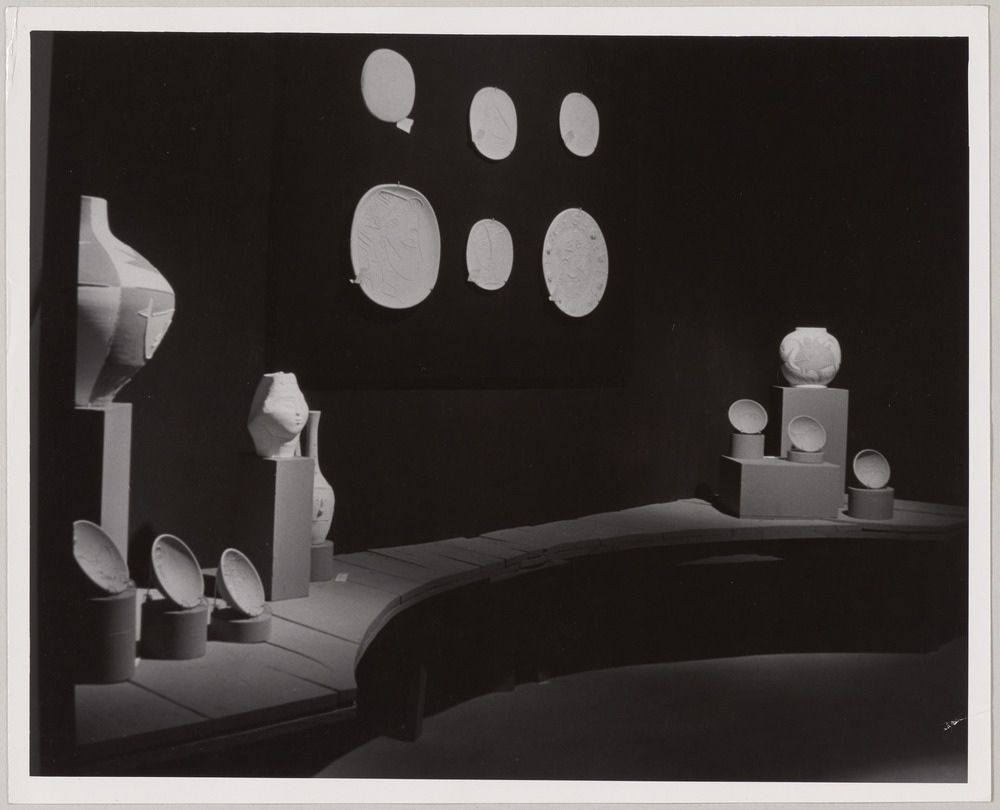 Céramiques présentées lors de l'exposition "Picasso : A loan of His Paintings, Drawings, Sculpture, Ceramics, Prints and Illustrated Books", Museum of Art, Philadelphie, en 1958