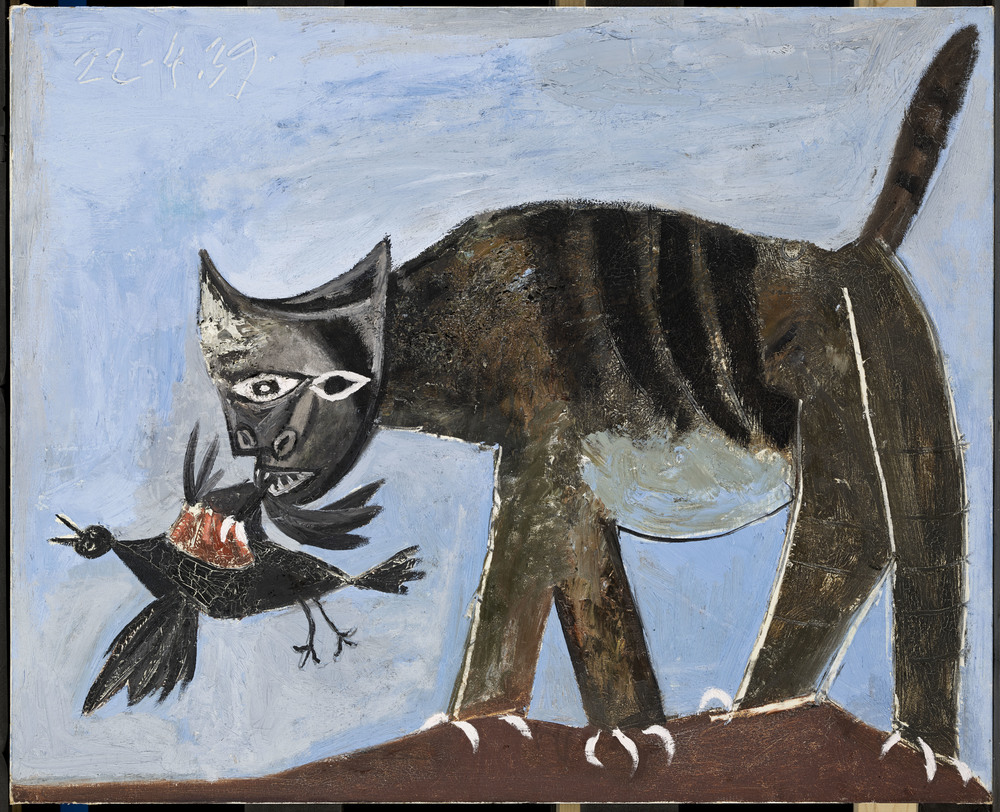 D'ornement pittoresque - sur le menu du restaurant Els 4Gats à Barcelone en 1900 (MP416 (V)) - ou alangui - au bout du lit dans la parodie de l'Olympia de Manet en 1902 - le chat mute en créature agressive dans Chat saisissant un oiseau en 1939. Picasso avait dit à Brassai pendant l'Occupation : « j'adore les chats devenus sauvages aux poils hérissés... Ils chassent les oiseaux, vadrouillent, courent dans les rues comme des démons... Ils vous jettent des yeux farouches, prêts à vous sauter à la figure... Et avez-vous remarqué que les chattes en liberté sont toujours en état de grossesse ? » La description du félin est fidèle à la représentation que Picasso en a donnée quelques temps auparavant – jusqu'à son apparente grossesse. C'est cependant sans aucune tendresse que l'animal est ici portraituré en prédateur carnassier. La facture du tableau en aplats et contours est économe, avec une base et un fond destinés à mettre en valeur l'affrontement. Au contraste cruel du rouge et du noir de l'oiseau blessé répond celui, hypnotique, du noir et du blanc des yeux du chat, portés sur sa face comme le masque ambivalent du sorcier vaudou, et en harmonie chromatique avec des griffes irradiantes. Une variante du même mois montre un chat mieux découplé dans l'espace du tableau, avec un traitement iconographique proche du dragon à la gueule infernale. Un dessin du 22 avril, centré sur la victime, substitue une volaille à l'oiseau ; le motif sera développé sur plusieurs pages de carnet en 1953 et à travers quelques dessins de la même année mettant aux prises un chat avec un coq, accusant la portée symbolique.