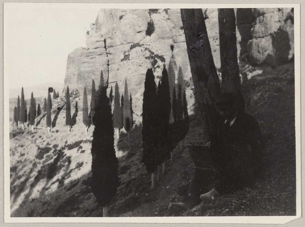 Annotation manuscrite au dos : "Horta de Suan Juan. Tarragona. España. Foto antigua segun cliché de D. Manuel Pallarés (aproximadamente año 1899 camino de la Cuevo de San Salvador. Durante la guerra civil española fueron derribados todos los arboles que se ven en esta fotografia actualmente la montaña esta pelada."