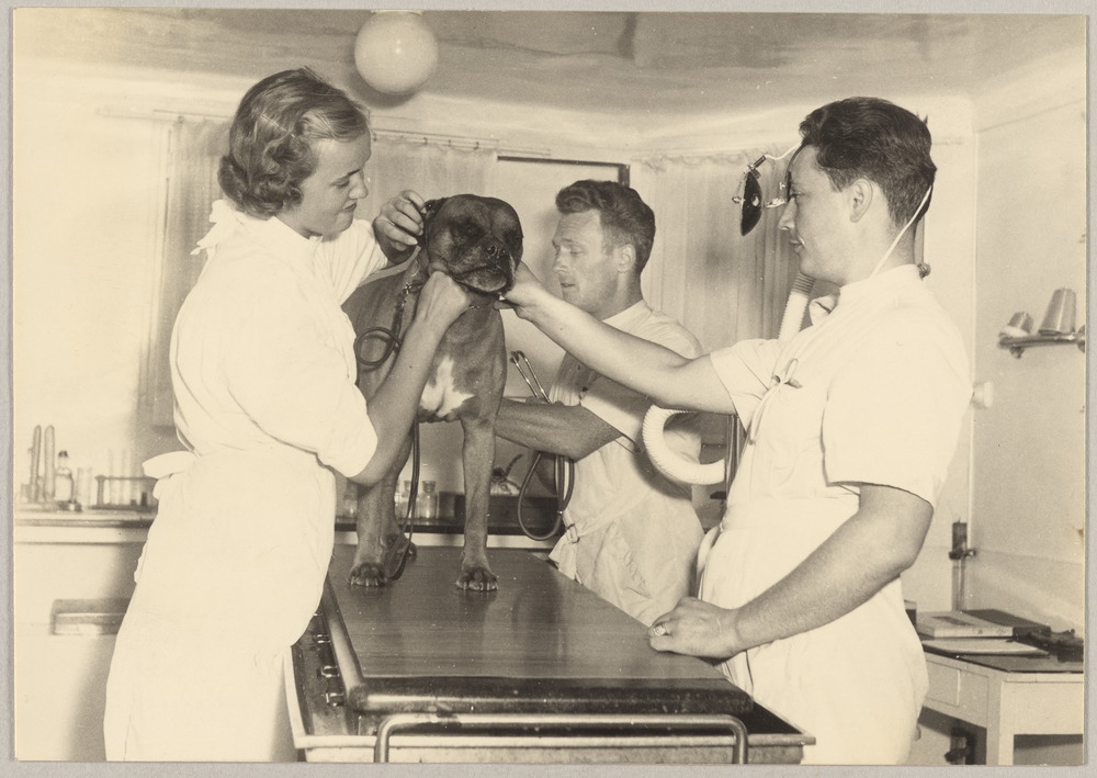 Chien examiné par trois vétérinaires [dans les années 1950]