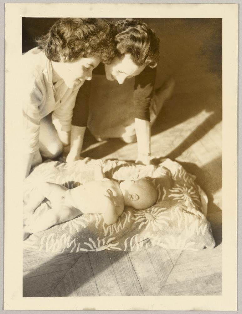 Christine Picasso et Catherine Hutin observant Bernard Picasso bébé allongé au…