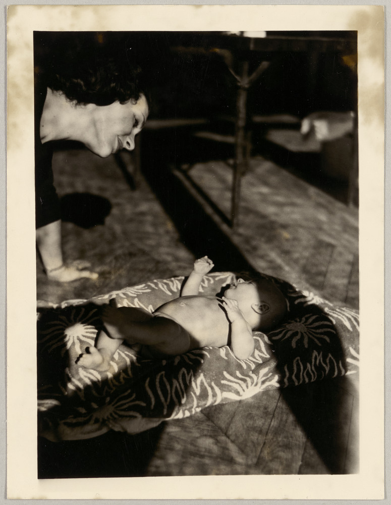 Christine Picasso observant son fils Bernard allongé au sol à La Californie, Cannes, en [1959]